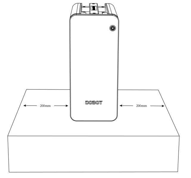 請將控制柜放置在越疆CR3機械臂工作空間外的水平臺面,并預留足夠的線纜接線空間和操作空間。控制柜安裝空間要求如下圖所示,左右需預留200mm的空間,出風口無堵塞,保證足夠的散熱空間。