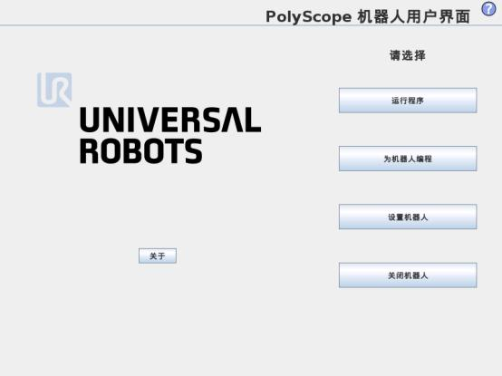 上圖顯示的是 “歡迎” 屏幕。屏幕淺藍區域的按鈕可通過手指觸摸或筆端觸碰來操作。PolyScope 以層級結構的形式來組織各個屏幕畫面。在編程環境中,屏幕以選項卡的形式組織排列以便于訪問。