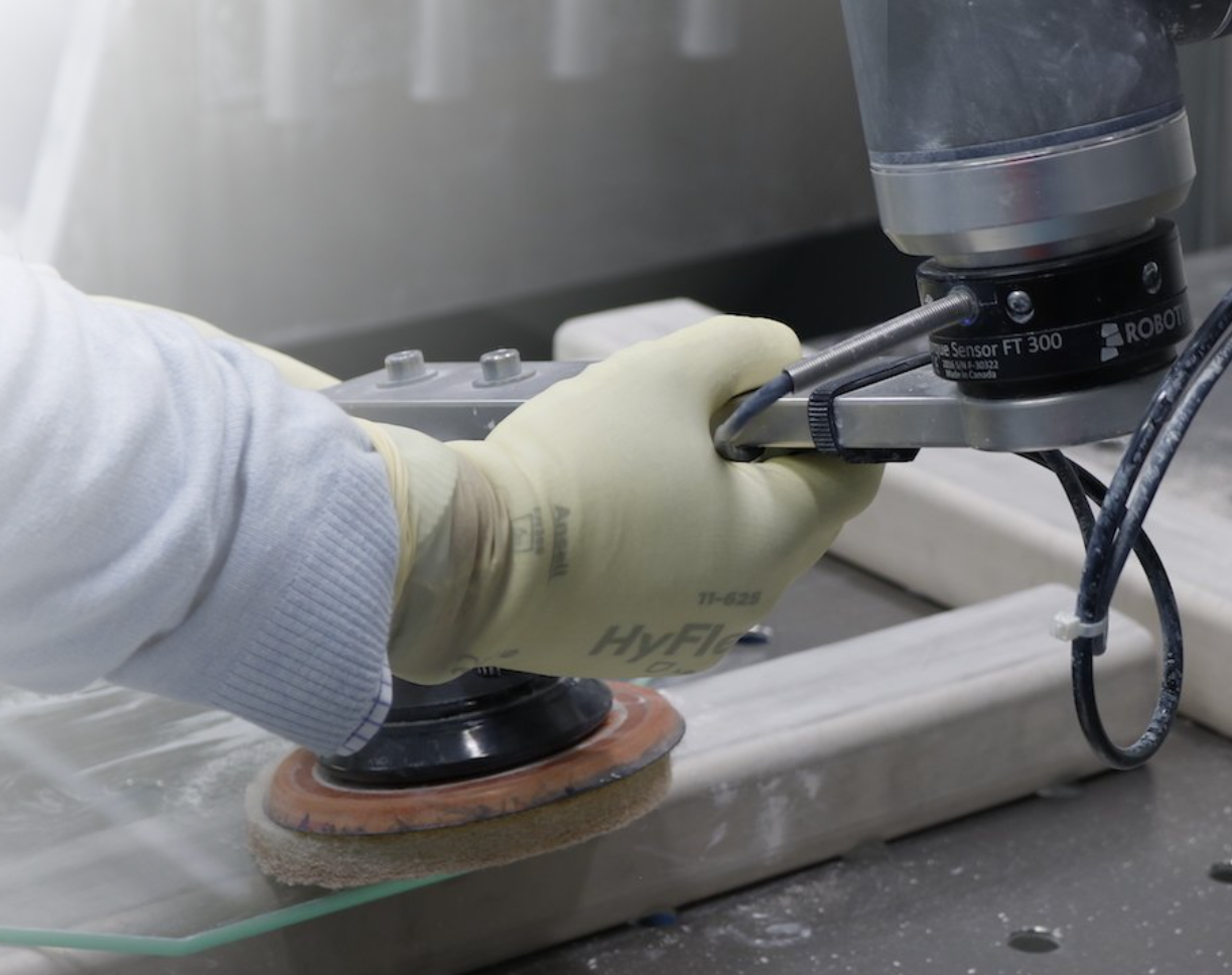 借助Robotiq FT 300力扭矩傳感器的路徑記錄功能,操作者可以抓住設(shè)備并進(jìn)行運(yùn)動(dòng);由Universal Robots UR10機(jī)器人記錄并再現(xiàn)操作員的動(dòng)作。操作員避免頻繁的肌肉骨骼疾病,專注于玻璃制備,這是一種無痛的增值操作。