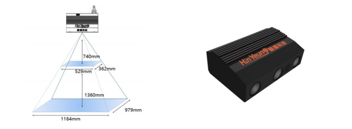 該解決方案包括三維視覺系統、機械臂和夾具、智能控制系統。三維視覺系統選用的是顯揚科技HY-M5三維視覺系統,該系統成像快、精度高。HY-M5掃描速度為10-300Hz,掃描精度能精確至±0.01mm,配合自研智能算法,可以快速掃描和獲取紙箱的尺寸、形狀、堆碼高度等信息,實現對紙箱的精準識別和定位。
