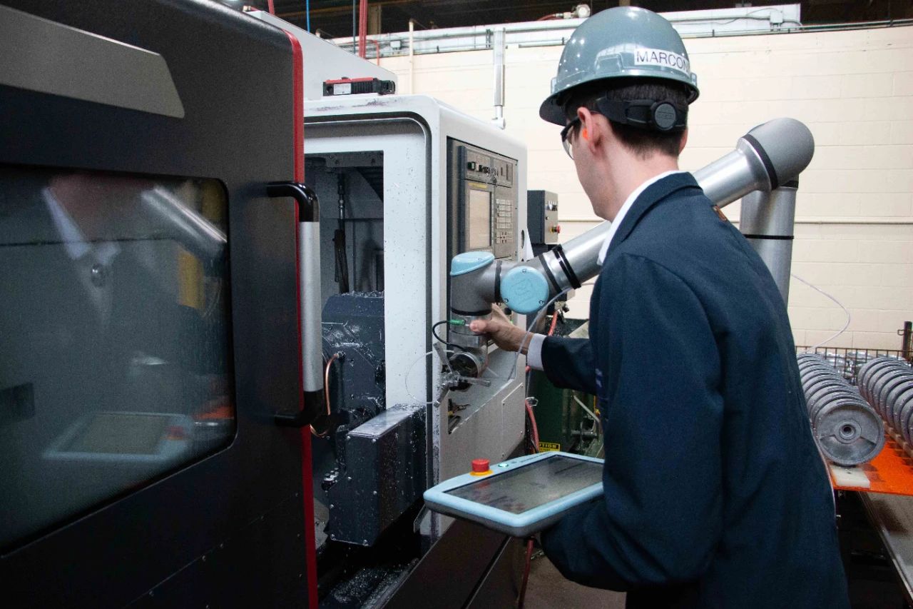 RCM Industries在兩個相同的工作單元里部署了優傲機器人。協作機器人在每個工作單元里分別控制兩臺雙主軸CNC車床,并以同樣的周期運作。引入協作機器人后,RCM Industries只需要一位巡檢員查看這兩個工作單元,減少人員接觸。